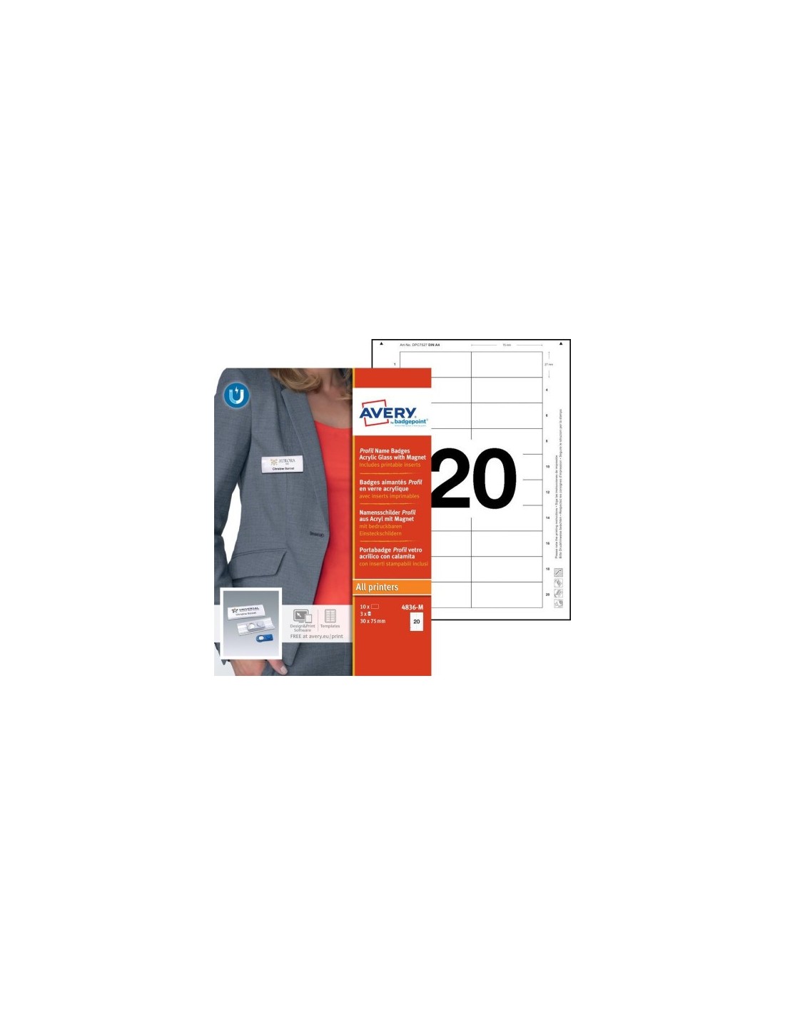 Avery 4836-M. Tipo de producto: Placa identificativa, Orientación: Apaisado, Material: Cristal acrílico. Ancho: 75 mm, Altura: 30 mm