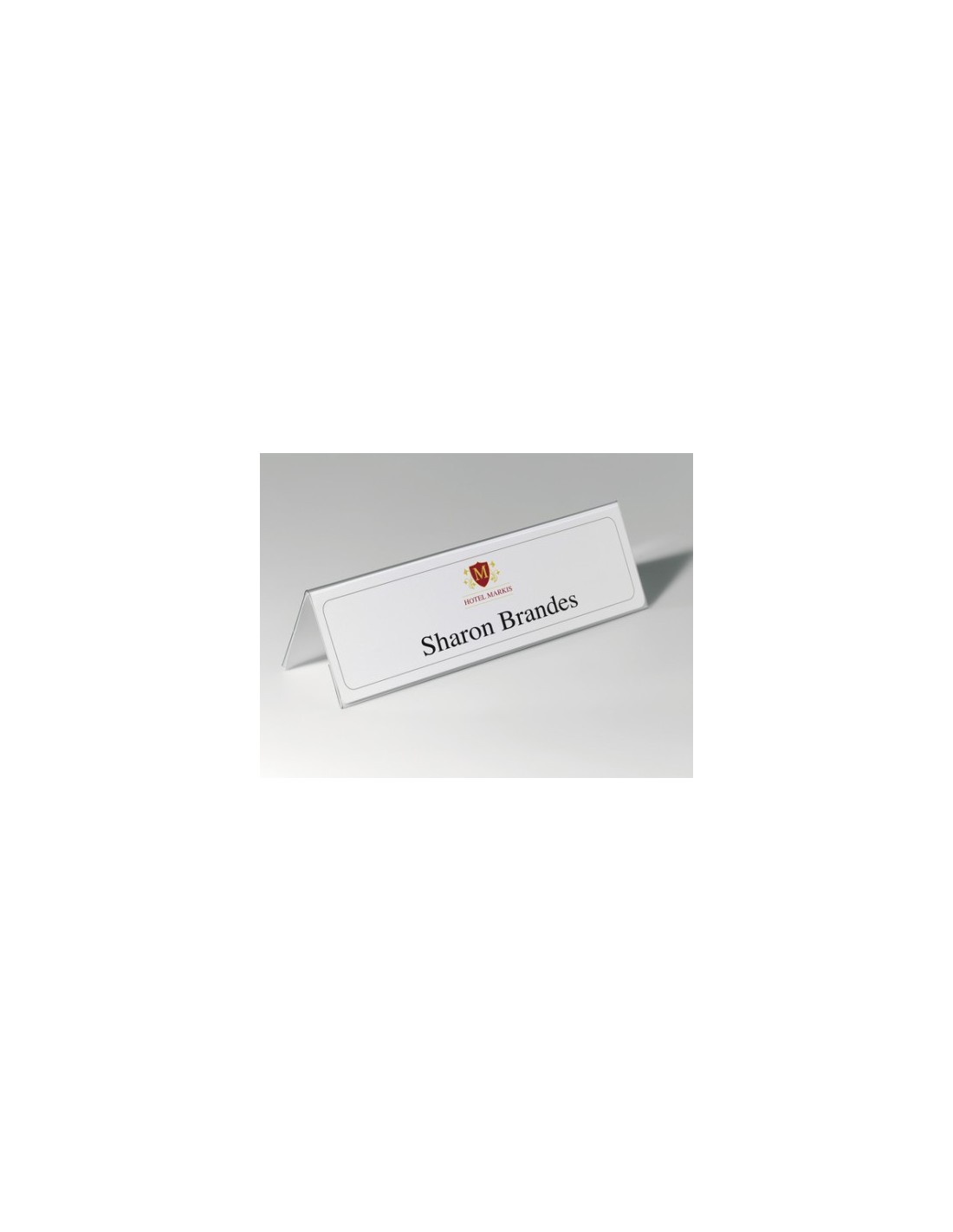 Ideal para conferencias, seminarios, recepciones y mostradores. Impresión sencilla y profesional con el software Legibles por ambos lados. Diseño estable con forma de tejado. Con etiquetas en blanco intercambiables con marco decorativo. Tamaño de la etiqueta: 105/210 x 297 mm.