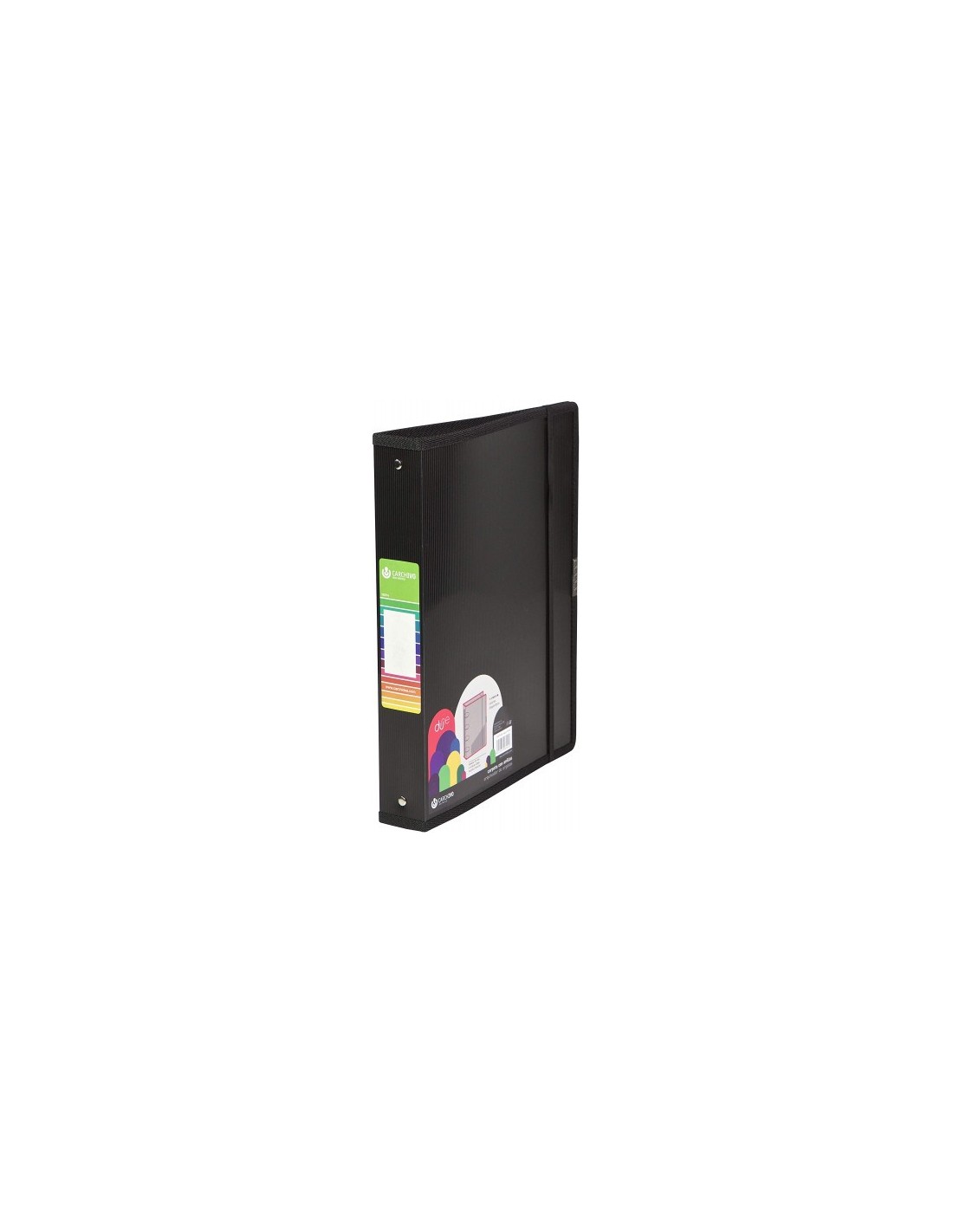 Carpeta de polipropileno rígido acanalado brillo 100% reciclable reforzado con ribete de tela en todo su contorno color a juego. Color negro.Provista de 4 anillas redondas de 25 mm. Incluye un bolsillo en su interior y una etiqueta personalizable en el lomo. Goma plana de cierre del mismo color. Permite guardar todo tipo de documentos tamaño A4 Plus (A4+) .