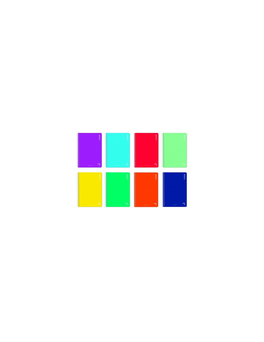 Cuaderno con tapa de cartoncillo plastificado 400 grs en 8 colores surtidos. Contraportada de cartoncillo 5400 gr estucado en blanco. 80 hojas de papel pautado 2,5 mm y 60 grs. Espiral con coil-lock nylonizado blanco. Tamaño folio.