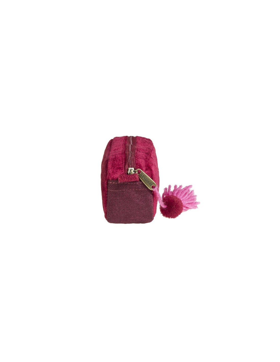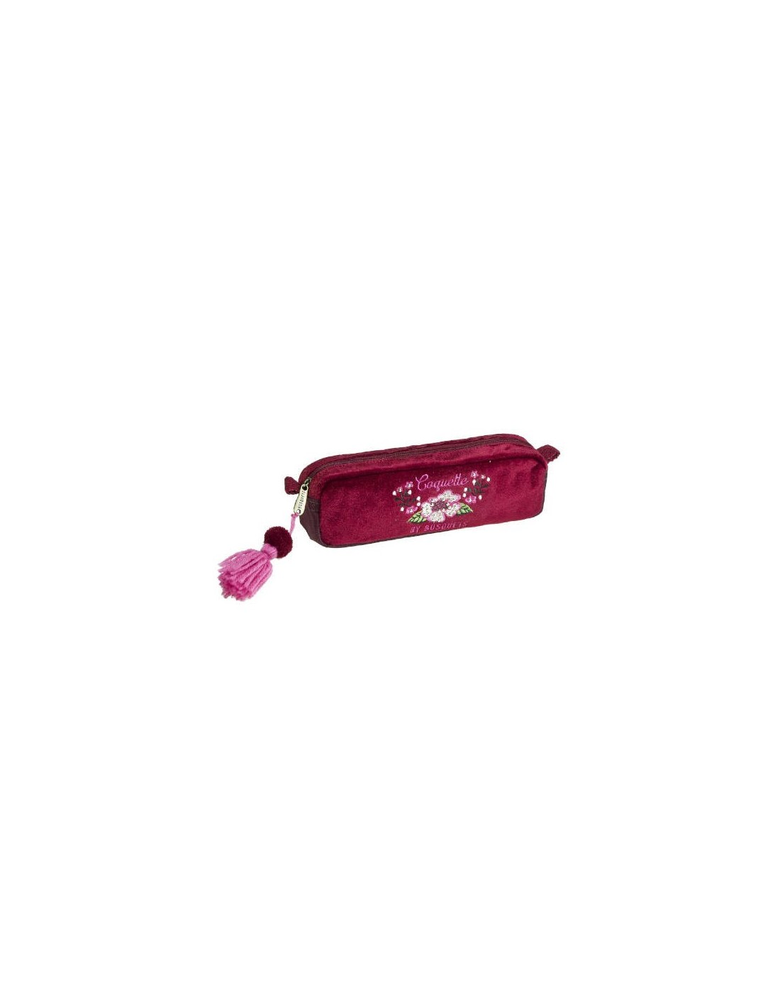 Estuche rectangular Coquette está decorado con tela de terciopelo de color granate, bordados de flores de colores rosas y hojas verdes con brillantes. Bordado del nombre del producto Coquette en color rosa. Correas del mismo color con forma de espiga y colgante de pompones y borlas. Los interiores están estampados con un decorado floral de color naranja y fucsia.Estuche rectangular Coquette tiene un solo compartimento con cierre de cremallera para llevar el material esencial. Dos tiras cortas en los laterales.