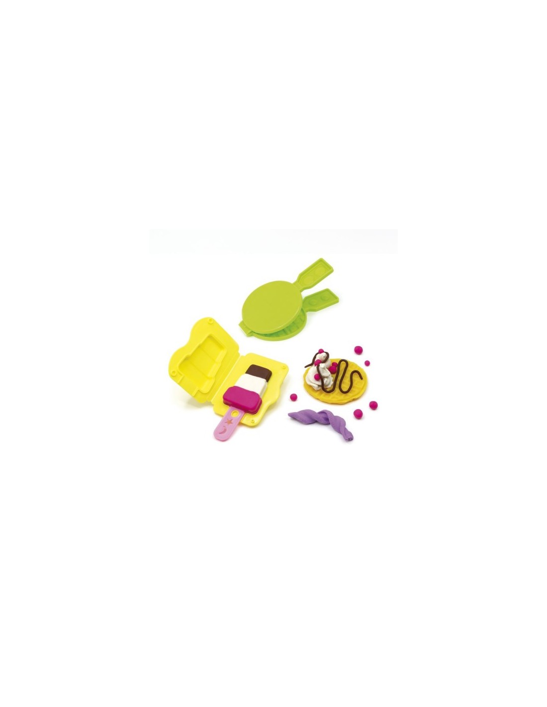 Kit de pasta blanda a base de trigo con herramientas "Helados y Gofres". Contenido del maletín: 6 botes de 59 g (de color blanco, amarillo, naranja, rosa, lila y marrón) y 10 piezas / herramientas. Soft Dough es una pasta consistente y elástica, fácil de modelar. Se pueden crear nuevos tonos combinando dos o más colores. No deja residuos en las manos. Ingredientes de origen vegetal (contiene gluten).