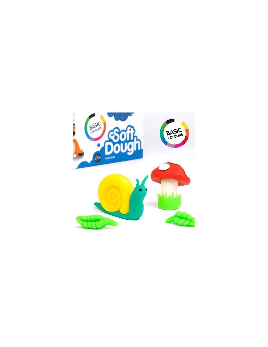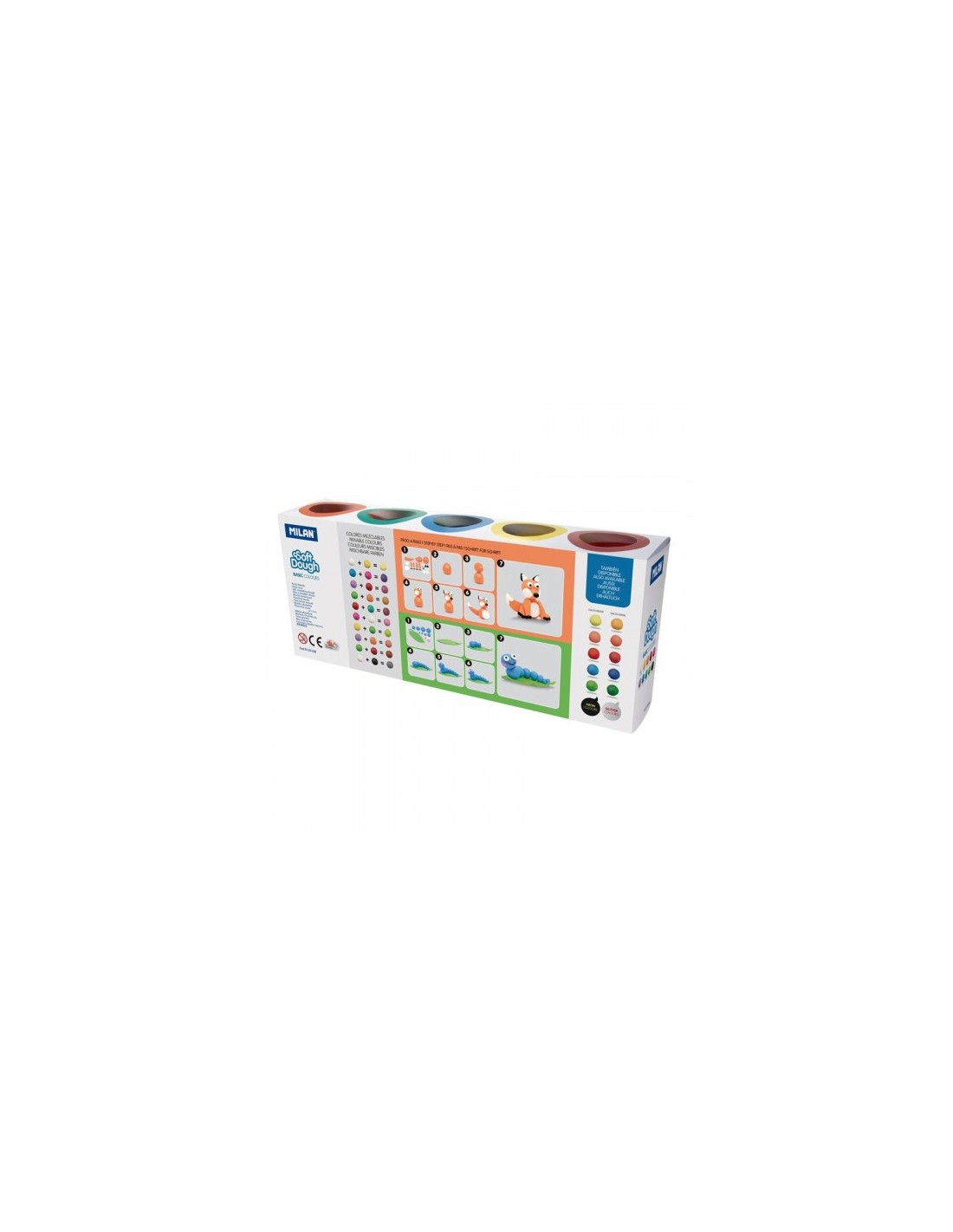 Pasta de modelar blanda "Soft Dough". Una pasta consistente y elástica, fácil de modelar. Contiene 10 colores: blanco, amarillo, naranja, rojo, rosa, lila, azul, verde claro, verde y negro. Se pueden crear nuevos tonos combinando dos o más colores. Nodeja residuos en las manos. Almacenada en botes de 85 g con tapa transparente apilables entre sí. Ingredientes de origen vegetal.