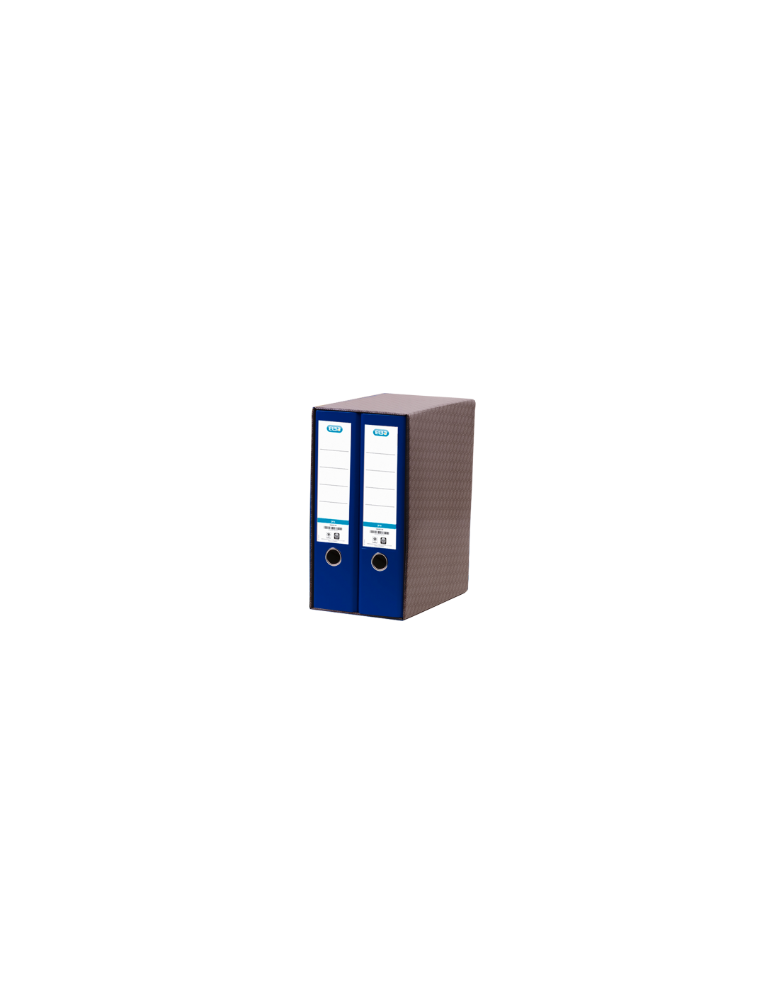 Archivadores forrados y plastificados en polipropileno con tarjetero, palanca, ollao y rado. Las cajas están fabricadas en cartón de doble microcanal barnizado y plastificado en polipropileno brillante. Dimensiones: 330x170x300mm. Incluyen cantoneras metálicas. Módulo de 2 archivadores de palanca A4 Elba Rado Top azul.