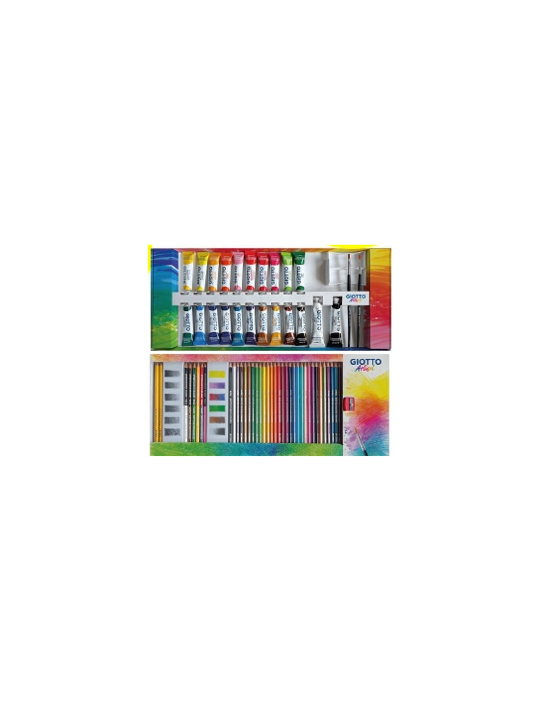 ArtiSet es el nuevo set de iniciación en técnicas húmedas de pintura con videotutoriales del paso a paso. Todo lo que necesitas para acercarte al mundo del dibujo y la pintura con la gama de pinturas Giotto Témpera en tubo, pinceles, accesorios, los lápices de colores acuarelables Giotto Stilnovo Acquarell y los lápices de colores Giotto Stilnovo Bicolor. Contenido de la primera bandeja: 2 x Giotto Témpera en tubo de 21 ml (colores 01 blanco y 24 negro), 1 x Giotto Pincel Serie 500 Taklon n.2, 1 x Giotto Pincel Serie 600 Taklon n.2, 2 x pocillos, 20 x Giotto Témpera en tubo 12 ml contenido de la segunda bandeja: 2 Lápices de grafito Lyra Temagraph (uno mina HB y otro mina B), 1 x sacapuntas, 6 x Giotto Stilnovo Bicolor, 30 x Giotto Stilnovo Acquarell.Medidas 45CM X 19CM X 6CM